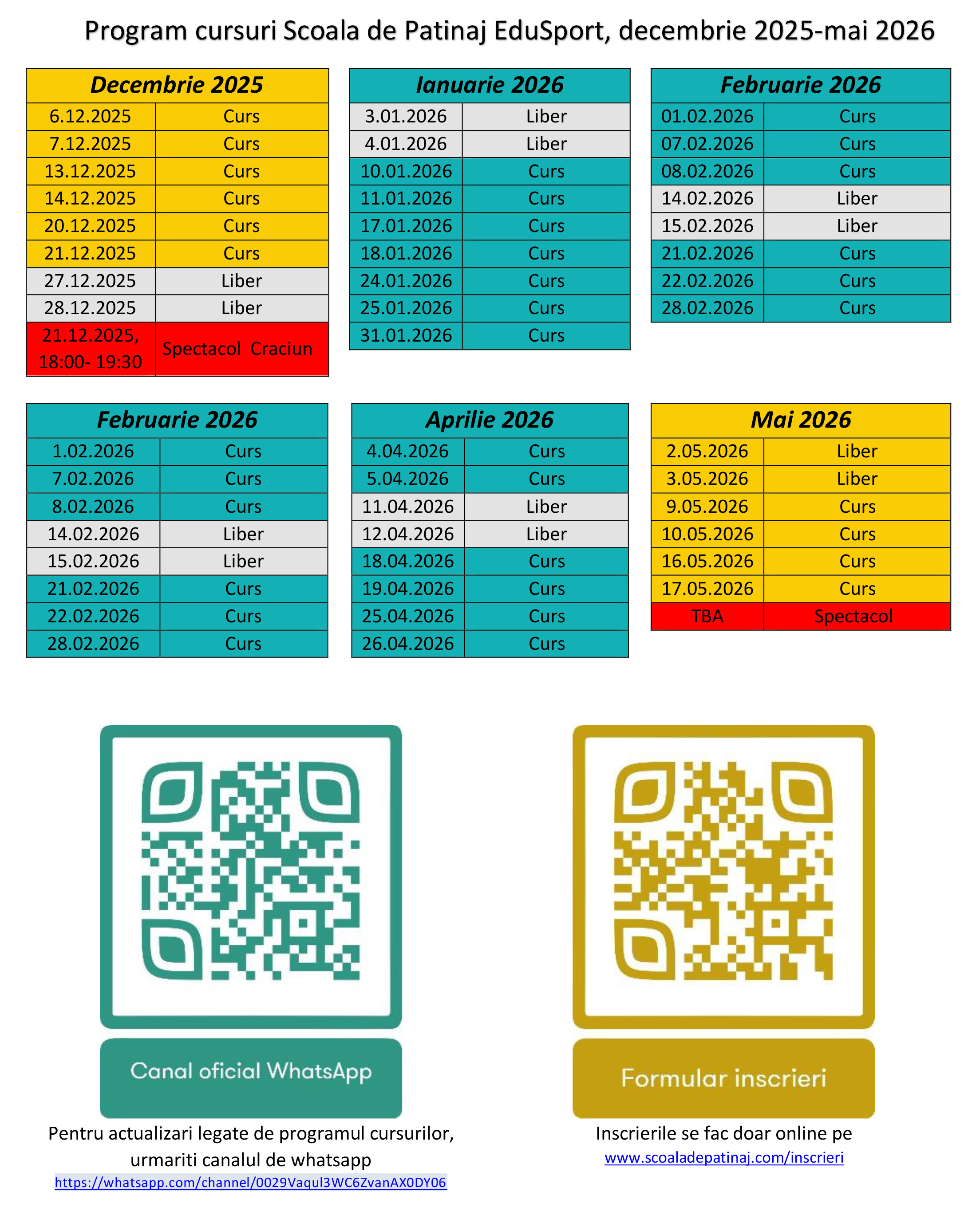 *Programul cursurilor poate suferi modificări în funcție de evenimentele desfășurate de patinoar sau alte situații ce obligă clubul să reprogrameze cursurile. In acest caz cursantii vor fi anuntati in cel mai scurt timp posibil. Sedințele care n-au fost tinute din motive obiective, vor fi reprogramate la o data ulterioara.